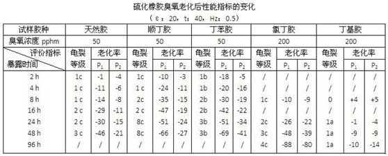 試驗(yàn)結(jié)果是根據(jù)評(píng)價(jià)指標(biāo)所觀測(cè)的數(shù)據(jù)來(lái)表示的。硫化橡膠臭氧老化的評(píng)價(jià)指標(biāo)有多種,常用而簡(jiǎn)便的多采用直接觀測(cè)法。主要是通過(guò)顯微鏡、放大鏡或肉眼直接觀測(cè)發(fā)生在試樣表面的臭氧龜裂,例如記錄裂紋首先出現(xiàn)的時(shí)間,或裂紋剛斷裂的時(shí)間。又如觀測(cè)試樣龜裂的特征和狀況,記錄龜裂的寬度和密度,從而評(píng)定試樣龜裂程度和等級(jí)。評(píng)價(jià)龜裂的等級(jí),可以參照GB11206《硫化橡膠老化表面龜裂試驗(yàn)方法》第10.3條的規(guī)定進(jìn)行。該標(biāo)準(zhǔn)將試樣表面的龜裂寬度分為1至4級(jí),龜裂密度分為a、b和c級(jí),兩者組合起來(lái)就表示其龜裂等級(jí)。試驗(yàn)結(jié)果也可用硫化橡膠的實(shí)用性能,如測(cè)試試樣老化前后的拉伸性能變化率來(lái)表示。由于硫化橡膠受臭氧老化后,結(jié)構(gòu)遭到破壞,分子鏈斷裂,表面形成裂紋,導(dǎo)致其拉伸性能發(fā)生變化。隨著老化的深入發(fā)展,表面龜裂也在增長(zhǎng)深化,使其拉伸性能如拉伸強(qiáng)度、扯斷伸長(zhǎng)率等逐漸變差變劣,從而間接也評(píng)價(jià)出該硫化橡膠耐臭氧老化性能的好壞。下表是幾種硫化橡膠試樣在臭氧老化試驗(yàn)箱內(nèi)經(jīng)不同的時(shí)間暴露后生成的臭氧龜裂等級(jí)與拉伸強(qiáng)度和扯斷伸長(zhǎng)率(老化率)相應(yīng)變化的試驗(yàn)結(jié)果。從表中可看出,試樣的龜裂變化與拉伸性能的變化有一定的相互關(guān)系,在各自的范圍內(nèi)都可以反映出試樣的耐臭氧老化性能,故它們都可以作為評(píng)價(jià)的指標(biāo)。因此,臭氧老化試驗(yàn)箱GB/T13642-1992標(biāo)準(zhǔn)除了采用試樣出裂時(shí)間和龜裂等級(jí)表示試驗(yàn)結(jié)果外,補(bǔ)充了可以采用試樣斷裂時(shí)間和老化性能變化率(老化率)來(lái)表示試驗(yàn)結(jié)果。