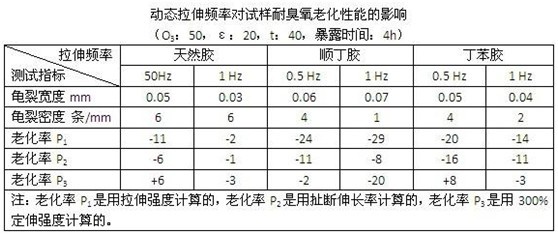 一般試驗選用的動態(tài)拉伸頻率,是以接近制品的實際使用狀態(tài),要求既加速老化而又不導致試樣發(fā)生機械疲勞龜裂為原則。如果采用的頻率過小,則起不到加速老化的效果,如果采用的頻率過大,則會使試樣疲勞龜裂取代臭氧龜裂,導致錯誤的試驗結果。大多數(shù)發(fā)達國家關與臭氧老化試驗箱的標準如BS、NF、ASTM,以及ISO等都采用相同的動態(tài)頻率進行試驗,即規(guī)定頻率為0.5Hz。但也有少數(shù)規(guī)定或設計的頻率為每分鐘拉伸10次,15次或60次。比較不同動態(tài)頻率的試驗,結果是有差異的,如下表所示。為靠攏國際標準,故臭氧老化試驗箱GB/T13642-1992標準規(guī)定試驗的動態(tài)拉伸頻率,也采用0.5Hz,即每分鐘拉伸30次。